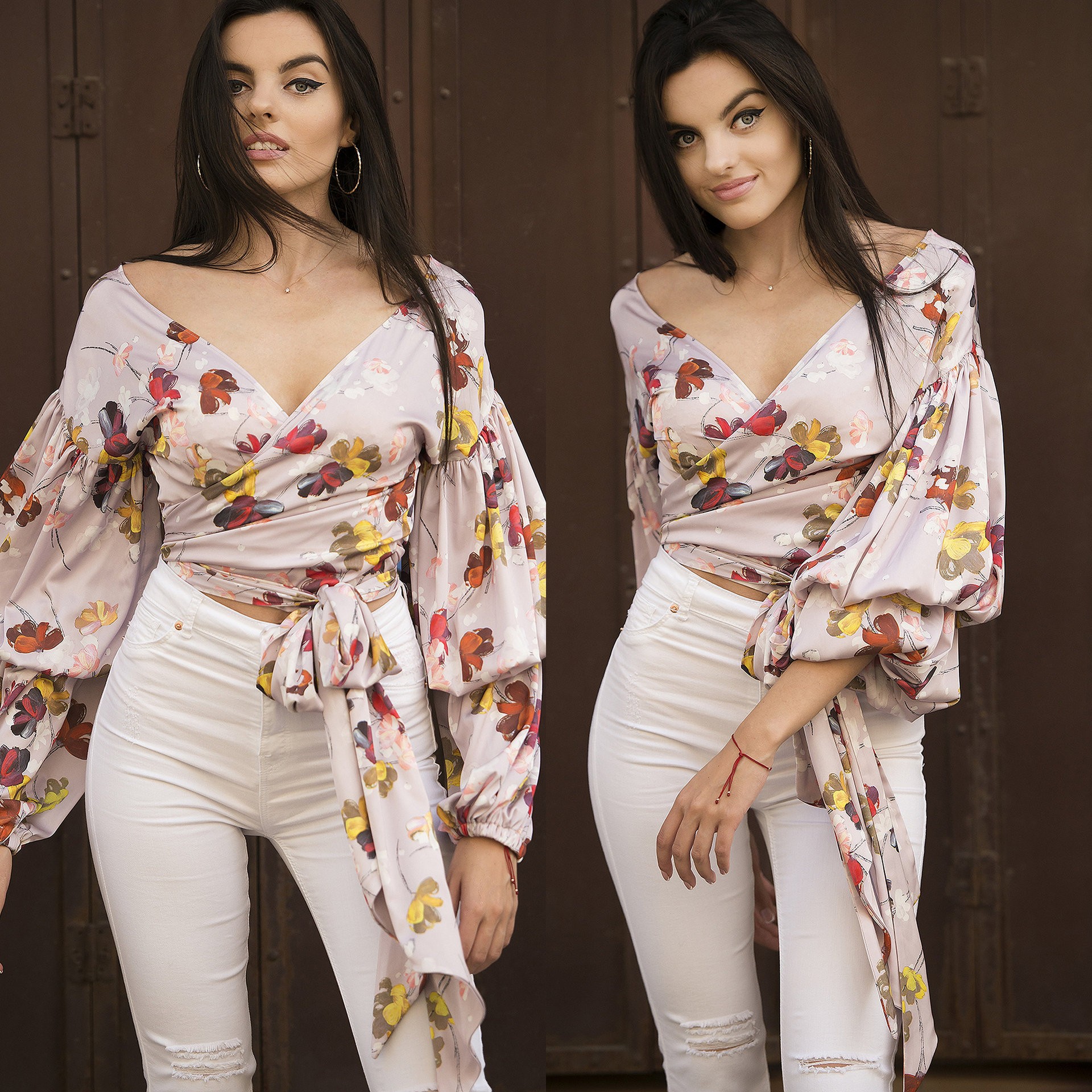 Spring New Style Solid Color Printed V Neck Long Sleeve Sexy Blouses For Women