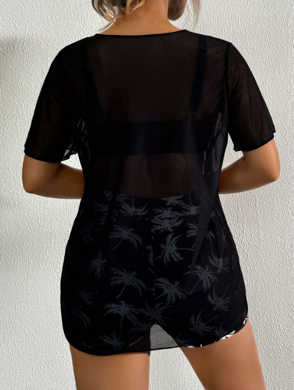 Ladies Printed Elegant Beach Swimwear Short Sleeves Mesh Top Shorts 2pcs Set