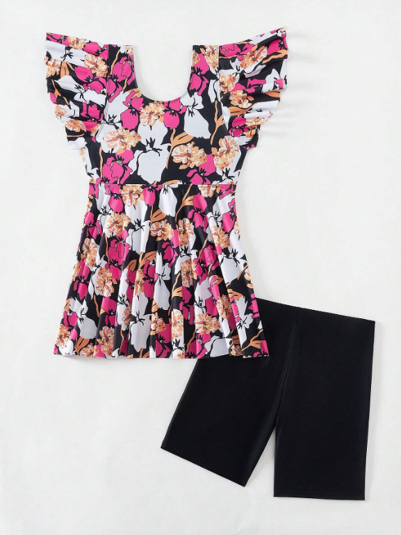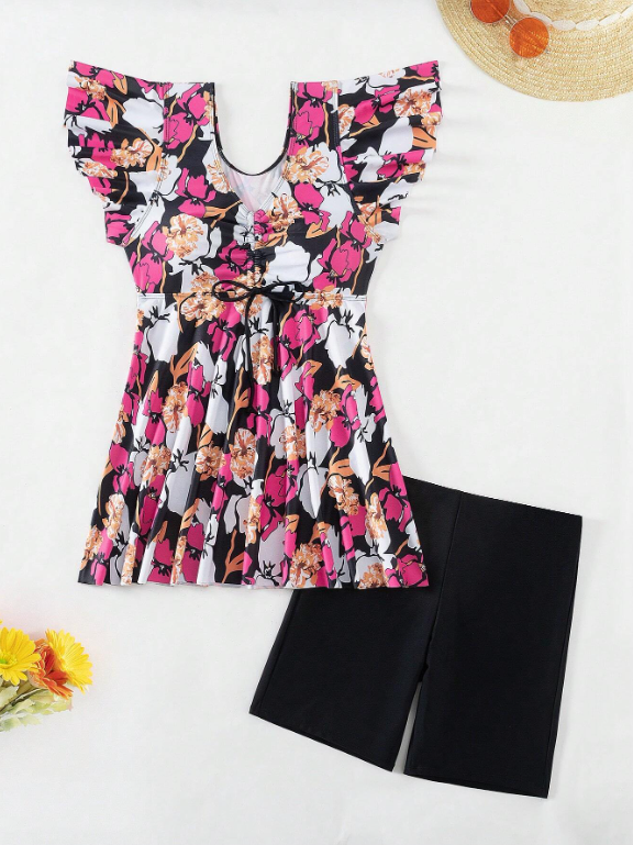 Summer Women Printed Elegant Short Sleeves Top Solid Color Shorts 2pcs Set
