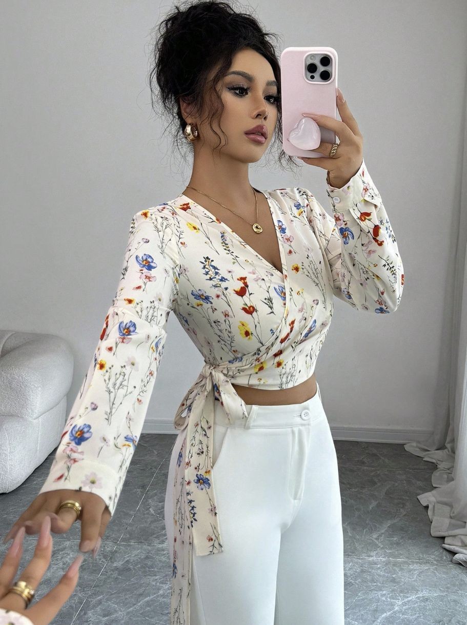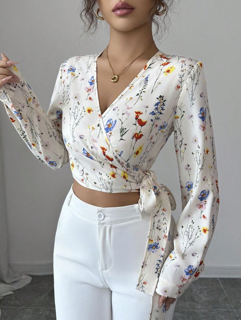 Spring New Cotton Printed V Neck Long Sleeve Sexy Blouses For Women