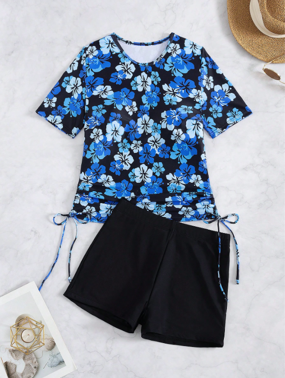 Women Printed Elegant Short Sleeves Top Solid Color Shorts 2pcs Set